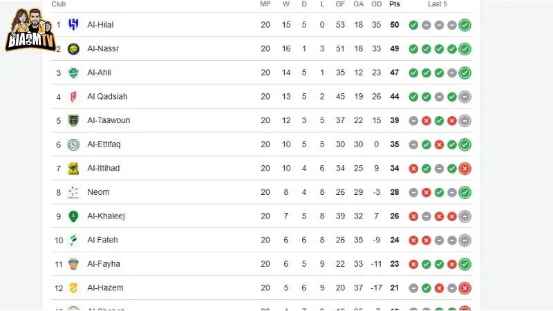 Trên bảng xếp hạng giải vô địch quốc gia Ả Rập Xê Út, Al Hilal vẫn đang tạm chiếm ưu thế nhưng khoảng cách với nhóm bám đuổi chỉ là 1 đến 2 trận thắng. Sự phân cực trên bảng xếp hạng Saudi League thể hiện rõ qua việc nhóm 4 đội dẫn đầu bỏ xa phần còn lại về cả điểm số lẫn hiệu số bàn thắng bại. Đặc biệt, cuộc chiến trụ hạng ở đáy bảng cũng khốc liệt không kém khi các đội bóng nhỏ đang nỗ lực chắt chiu từng điểm số để ở lại với giải đấu đắt giá nhất khu vực.