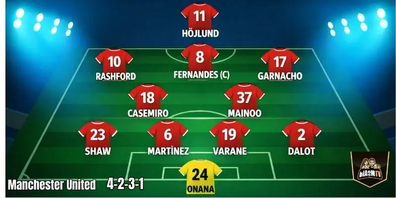 Manchester United thường sử dụng sơ đồ 4-2-3-1 nhằm tối ưu hóa khả năng kiểm soát bóng và tạo ra nhiều phương án tấn công.