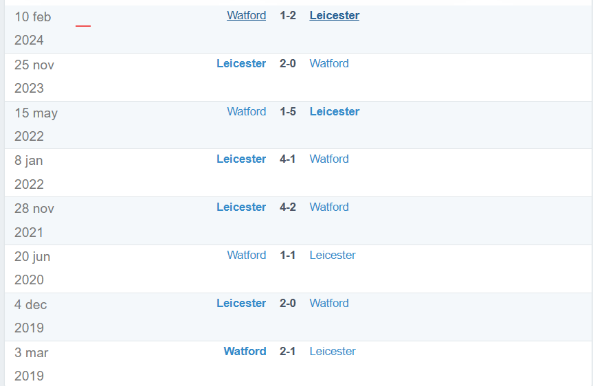 Xét về thành tích đối đầu, Leicester hoàn toàn vượt trội khi toàn thắng trong 5 lần chạm trán gần nhất với Watford, thậm chí xa hơn là chuỗi 7 trận bất bại trên mọi đấu trường. Với những yếu tố đó, khả năng Leicester giành trọn 3 điểm ở trận đấu này được đánh giá là rất cao.