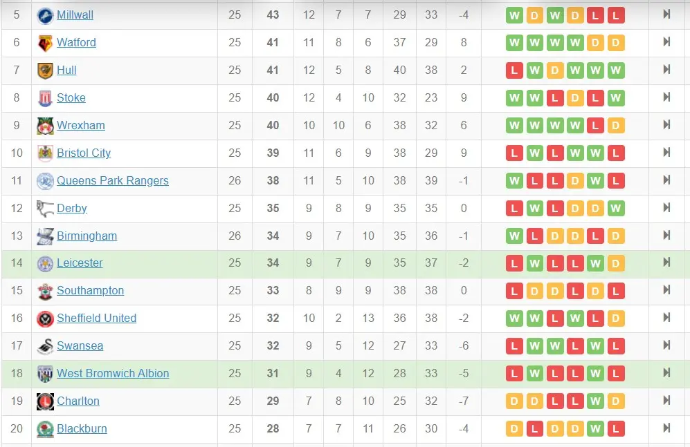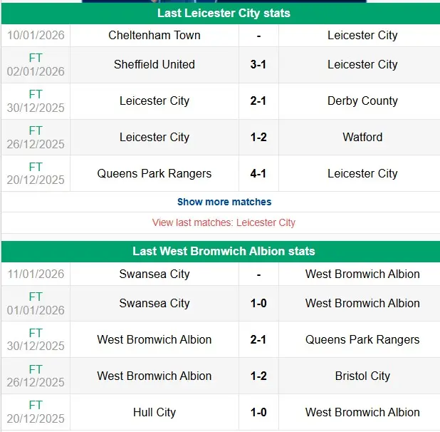 Sau 25 vòng đấu, Leicester đã để thủng lưới 37 bàn. Đáng chú ý, kể từ trận hòa không bàn thắng trước Coventry City vào tháng 9 năm ngoái, họ đã trải qua chuỗi 19 trận liên tiếp không thể giữ sạch lưới. Dù vậy, West Brom cũng không khá hơn là bao. Đội bóng này vừa thua 3/4 trận gần nhất và đang thể hiện bộ mặt rất kém cỏi mỗi khi rời xa sân nhà, với chuỗi 9 thất bại liên tiếp trên sân khách.