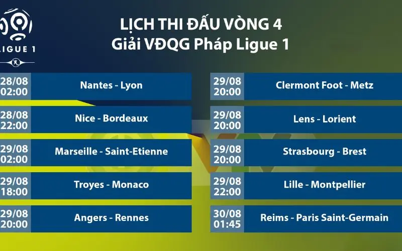 Một trong những yếu tố quan trọng giúp người hâm mộ theo dõi các trận đấu Ligue 1 là giờ thi đấu Ligue 1 theo giờ Việt Nam để không bị bỏ lỡ các trận đấu chính của mùa giải. Các trận đấu của lịch thi đấu Ligue 1 đều được xác định rõ ràng và có tính linh hoạt theo từng vòng, từng ngày, giúp khán giả dễ dàng sắp xếp thời gian xem.