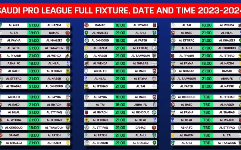 Phần lớn các mùa giải của giải VĐQG Ả Rập Xê Út đều có quỹ thời gian kéo dài từ 30 đến 34 vòng, tùy theo thể thức của từng mùa giải. Với mục tiêu tạo điều kiện thi đấu hợp lý, tránh quá tải cho các cầu thủ, Ban tổ chức lịch thi đấu Saudi Pro League thường sắp xếp các vòng đấu xen kẽ, đảm bảo chất lượng và tính công bằng các trận tranh tài.