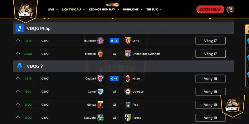 BiaomTV hiển thị thời gian thi đấu theo giờ Việt Nam, giúp anh em chủ động sắp xếp thời gian theo dõi trận đấu, đặc biệt với những trận diễn ra vào buổi tối hoặc rạng sáng.