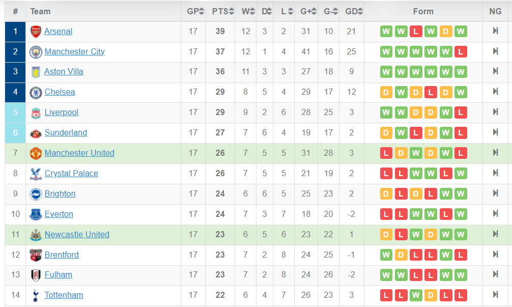 Sau giai đoạn đầu của Ngoại hạng Anh 2025/26, Manchester United đang xếp thứ 7 với 26 điểm. Dù vậy, khoảng cách giữa họ và top 5 – nơi Liverpool đang án ngữ – chỉ là 3 điểm, cho thấy cuộc đua vẫn còn rất rộng mở. Điều kiện tiên quyết là MU phải chơi ổn định hơn và không lặp lại những sai lầm đã mắc phải.