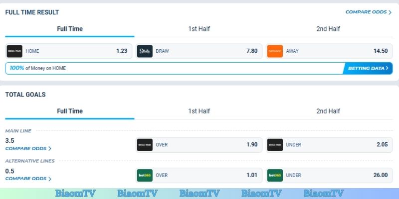 Nhận xét: Tỷ lệ ăn cược chỉ một phẩy hai mươi ba cho thấy nhà cái đánh giá khả năng chiến thắng của PSG gần như là tuyệt đối. Trong khi đó, cửa thắng của Nantes lên tới mười bốn phẩy năm mươi, phản ánh thực trạng vô vọng của đội khách lúc này. Đặt niềm tin vào PSG là lựa chọn duy nhất đúng đắn cho các nhà đầu tư thông thái.