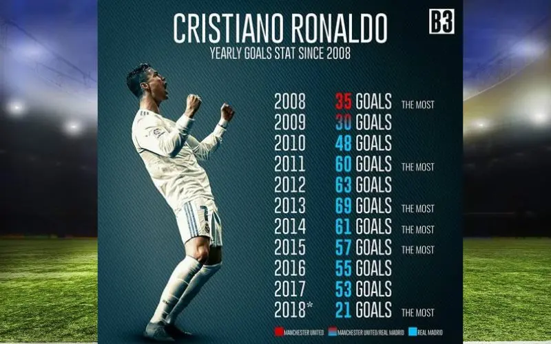 Một tượng đài bóng đá đương đại, một hình mẫu lý tưởng cho vô số cầu thủ trên khắp thế giới. Một cầu thủ có hiệu suất ghi bàn hàng đầu thế giới qua nhiều thập kỷ. Số liệu thống kê về Cristiano Ronaldo luôn là đề tài được quan tâm đặc biệt mỗi khi anh xuất hiện trên sân, bất kể khoác áo câu lạc bộ nào. Tiền đạo người Bồ Đào Nha đã trải qua hơn hai thập kỷ để tạo ra một loạt kỷ lục ghi bàn mà giới chuyên môn khó có thể hình dung. Trang web bóng đá Biaom TV trân trọng mang đến một cái nhìn sâu sắc về khả năng săn bàn đáng kinh ngạc của chủ nhân 5 Quả bóng Vàng thế giới.
