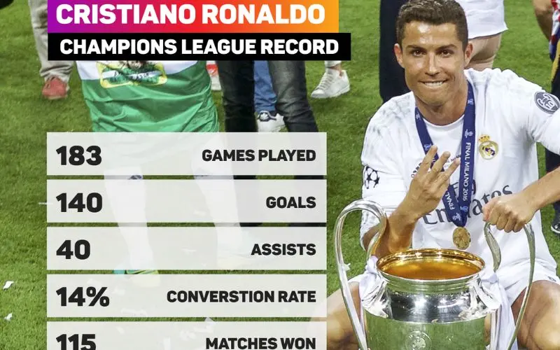 Nếu Champions League là đỉnh Everest của bóng đá châu Âu, thì Cristiano Ronaldo là người đã cắm cờ trên đỉnh cao đó. Tính đến khi rời giải đấu này, anh đã ghi được 140 bàn thắng tại UEFA Champions League, con số cao nhất trong lịch sử giải đấu. Thành tích này được thiết lập sau hơn 180 lần ra sân, với hiệu suất xấp xỉ 0,75 bàn/trận, một con số cực kỳ ấn tượng ở một sân chơi quy tụ những nhà vô địch quốc gia hàng đầu.