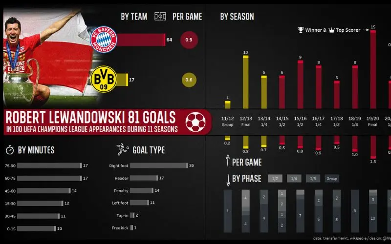 Không chỉ thống trị ở giải quốc nội, Lewandowski còn khẳng định đẳng cấp thế giới tại sân chơi danh giá nhất châu Âu. Những con số thống kê ấn tượng đã đưa anh vào hàng ngũ những chân sút vĩ đại nhất lịch sử giải đấu.