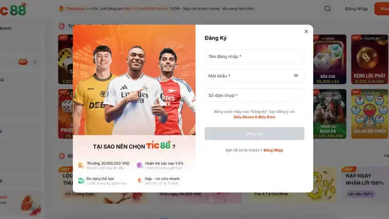 Trước tiên bạn truy cập vào trang chủ chính thức của Tic88. Hãy chắc chắn bạn đến đúng địa chỉ để tránh bị giả mạo. Sau đó bạn tìm nút “Đăng ký” và nhập các thông tin cơ bản như tên người dùng, mật khẩu, số điện thoại.